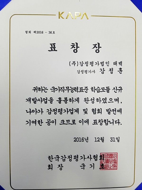 강정훈 이사는 국가직무능력표준 학습모듈 신규 개발사업을 훌륭하게 완성하였으며 감정평가업계 발전에 기여한 공로를 인정받았다.