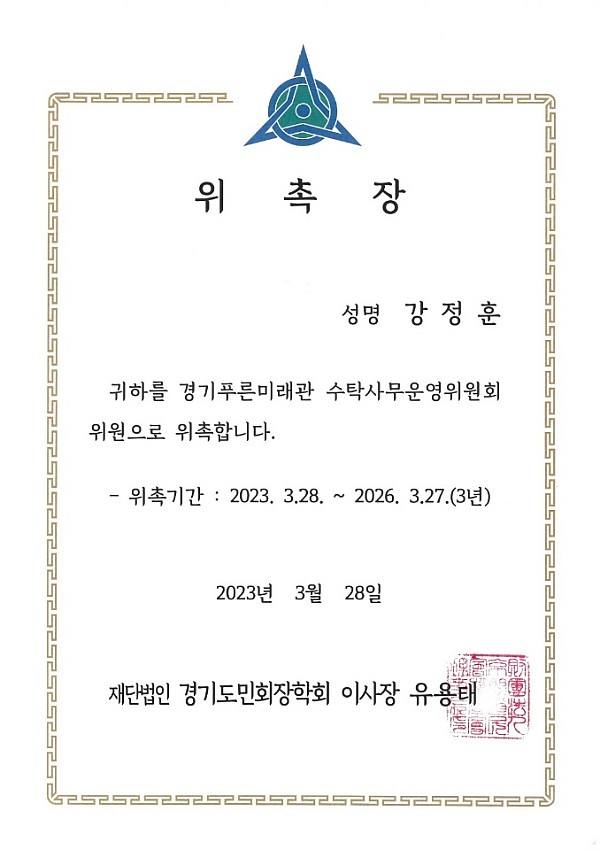 축 강정훈 이사 경기푸른미래관 수탁사무운영위원 위촉 페이지 정보 작성자 태백감정평가 작성일24-03-29 17:18 조회5,893회 댓글0건 이전글 다음글 목록 본문 강정훈 이사는 지난 3월 28일, 경기푸른미래관 수탁사무운영위원으로 위촉되었습니다. 강이사는 "예산이 재사쟁들을 위해 잘 쓰일 수 있도록 세심하게 살필 것"이라고 소감을 밝혔습니다. 이전글 다음글 목록