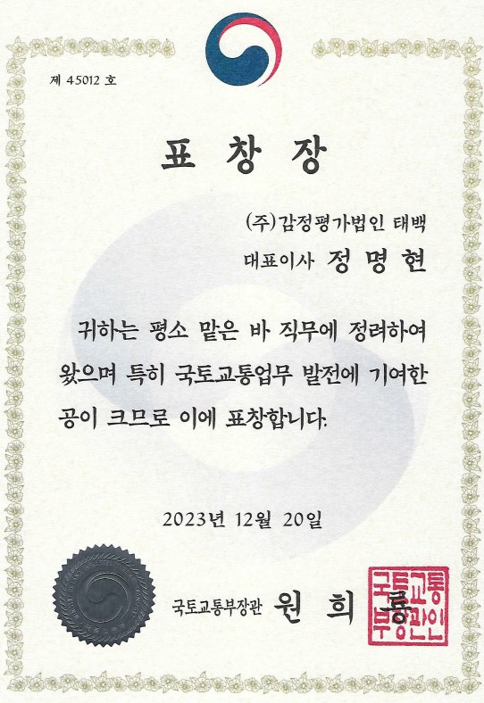 축 정명현 대표이사 국토교통부 장관 표창장 수상 페이지 정보 작성자 태백감정평가 작성일24-01-10 12:29 조회5,551회 댓글0건 이전글 다음글 목록 본문 감정평가법인 태백 정명현 대표이사님께서 국토교통부 장관으로부터 국토교통업무 발전에 기여한 공로를 인정받아 표장장을 받게 되었습니다. 이전글 다음글 목록