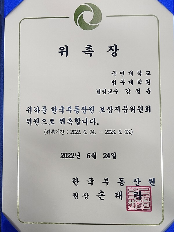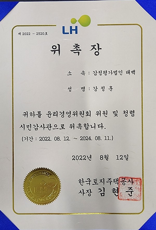 축 강정훈이사 위촉장 수여 페이지 정보 작성자 태백감정평가 작성일22-08-23 17:33 조회8,249회 댓글0건 이전글 다음글 목록 본문 감정평가법인 태백 강정훈 이사님께서 한국부동산원과 한국토지주택사로부터 각각 보상자문위원회 위원과 윤리경영위원회 위원 및 청렴시민감사관에 위촉되었습니다. 이전글 다음글 목록